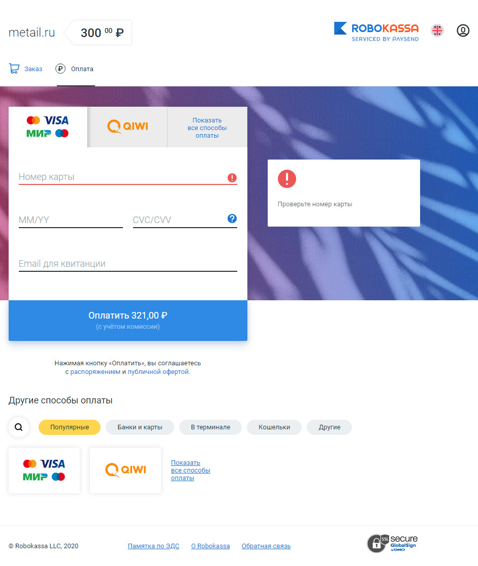 После нажатия кнопки "Оплатить" вы попадаете на защищённую страницу сервиса приёма платежей, выбираете способ оплаты, заполняете необходимые поля.