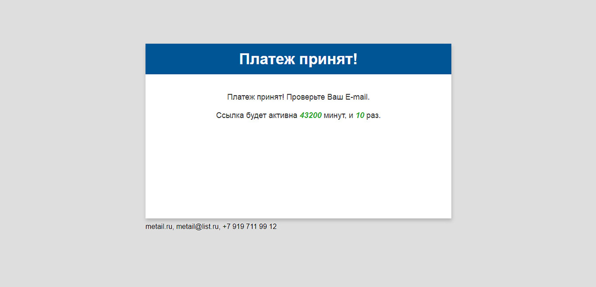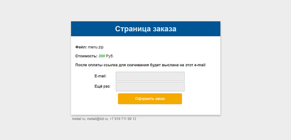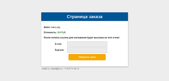 1. Нажимаем на ранее созданную ссылку Скачать или откройте ссылку https://ваш домен.ру/sellfileeasy/archive/199/файл для скачивания.zip. Мы попадаем на Страницу заказа.