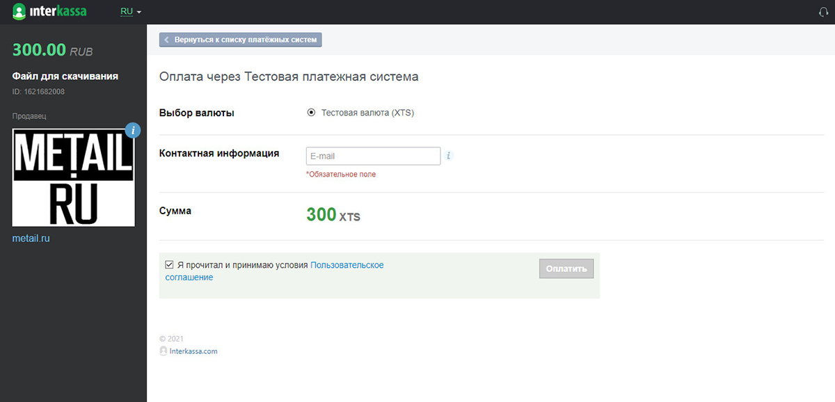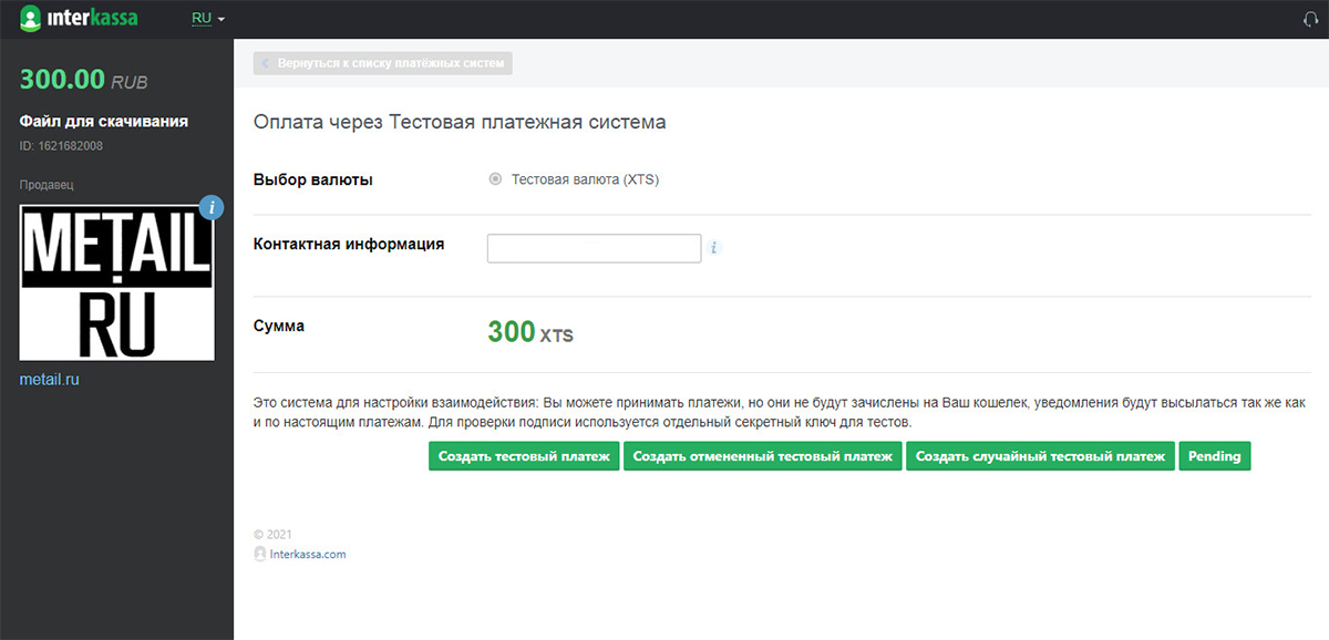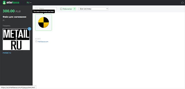 3. Нажимаем Interkassa и попадаем на сайт interkassa.com, где присутствует только Тестовая платёжная система, так как остальные у нас отключены или пока недоступны.