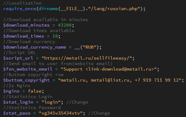 7. В файле https://ваш домен.ру/sellfileeasy/config.php задайте свои значения переменным
