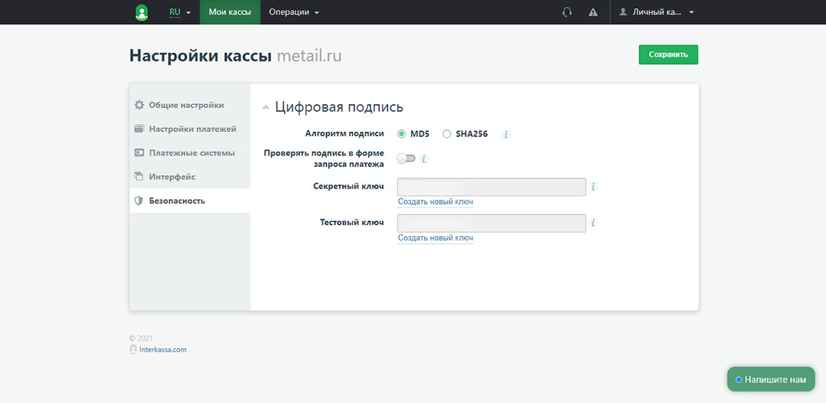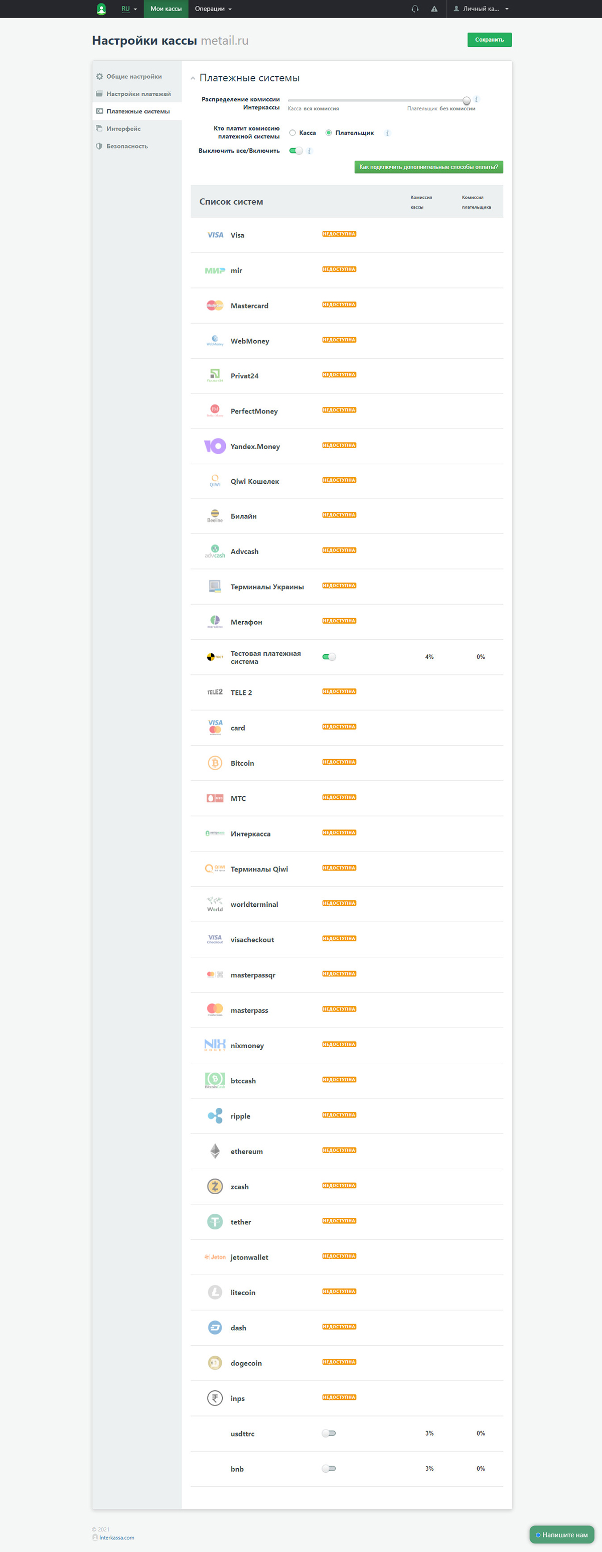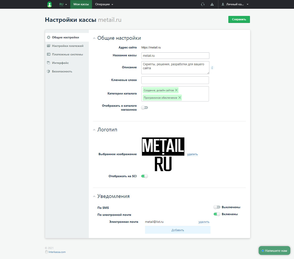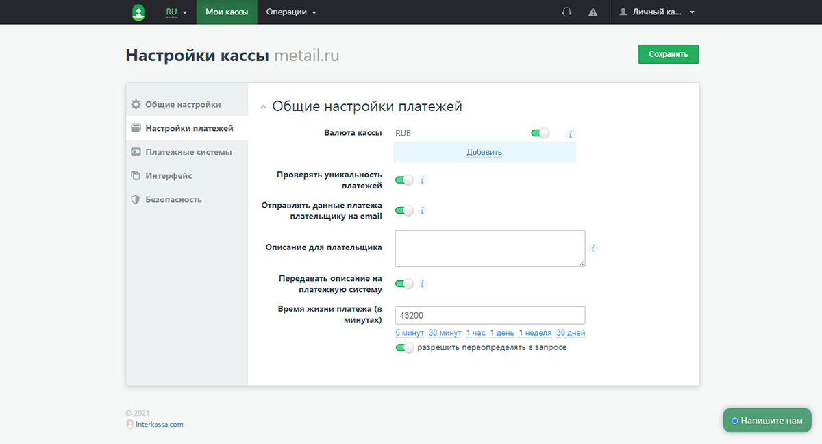 3. Настраиваем созданную кассу по вкладкам: общие настройки, настройки платежей, платёжные системы, интерфейс, безопасность.